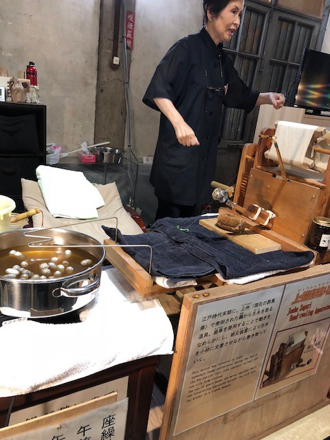 繭玉をお湯の中でぐるぐるかき混ぜて、20個の繭玉の糸を束ねて1本の糸にする。